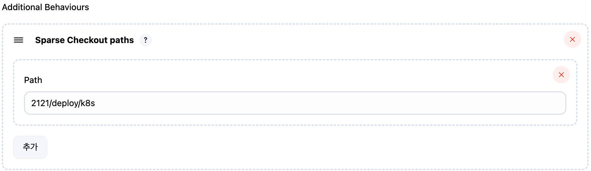 Additional Behaviors → Sparse Checkout paths 항목을 다시 추가하고, 배포에 필요한 K8s 매니페스트 파일들이 포함된 경로를 지정해줍니다.