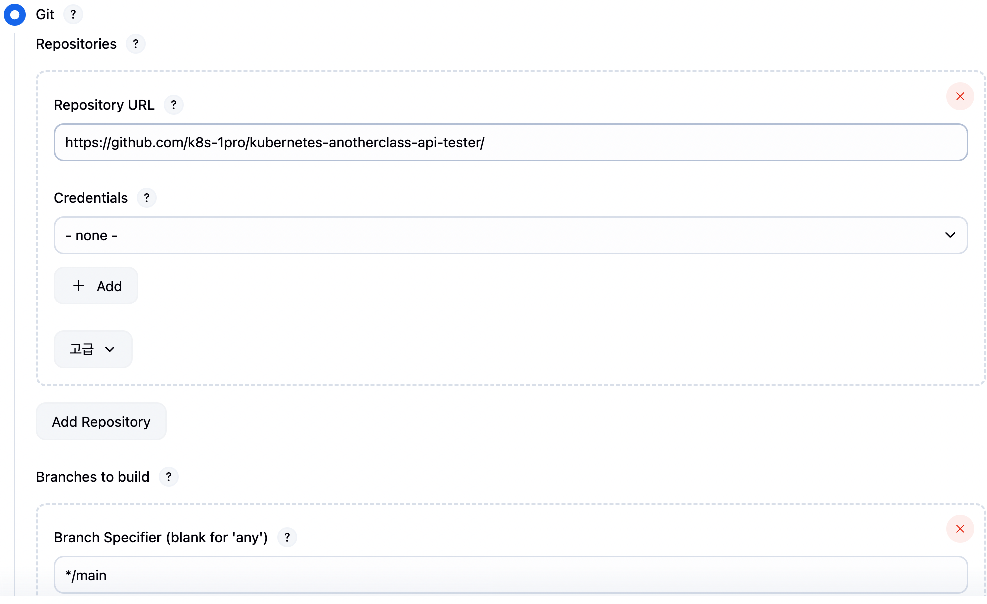 Source Code Management 섹션에서 Git을 선택하고, Repository URL과 브랜치 이름(main 등)을 입력합니다.
