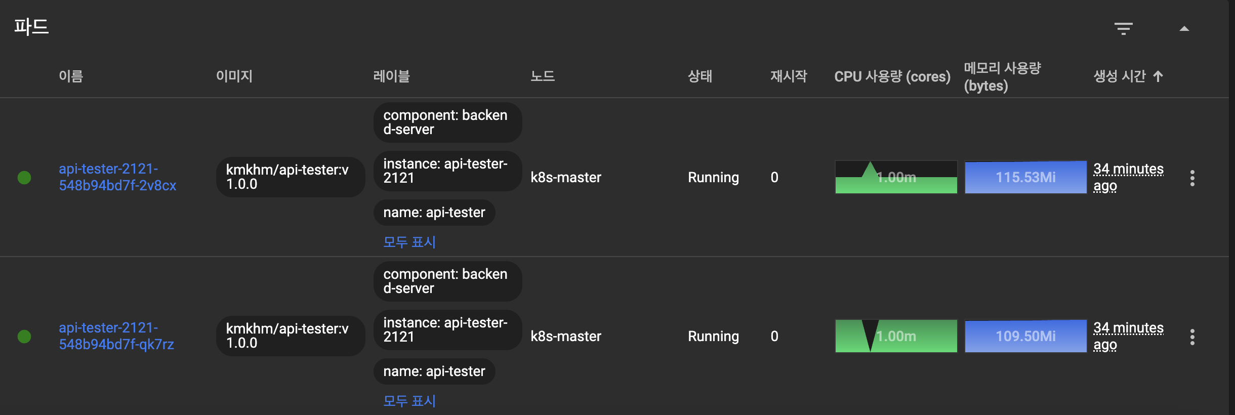 item 빌드 후, 배포가 정상적으로 완료되면 다음과 같이 대시보드에서 Pod를 확인할 수 있습니다.
