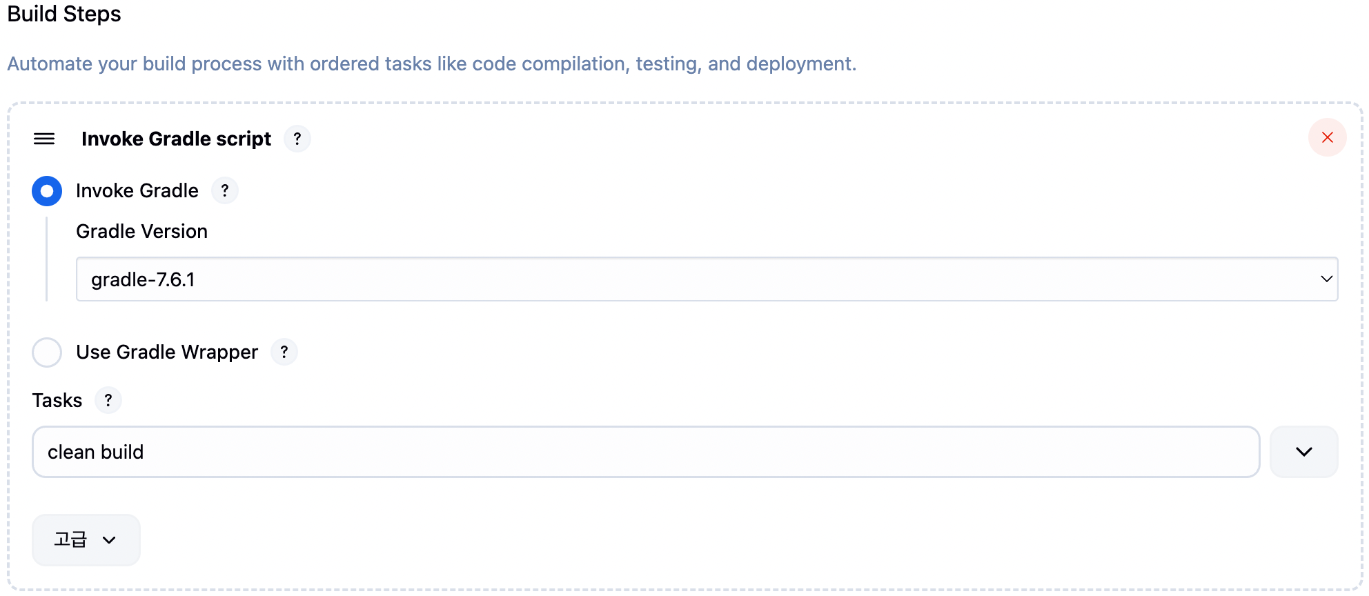 Build 섹션에서 Invoke Gradle script를 추가합니다. Tasks에는 clean build를 입력합니다. 이전에 생성된 산출물을 모두 삭제하고, 프로젝트를 빌드하여 .jar 파일 등 결과물을 생성해야 하기 때문입니다.