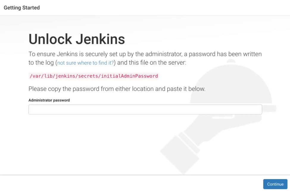 웹 브라우저에서 http://<서버 IP>:8080으로 접속하면 아래와 같은 Unlock Jenkins 화면이 나타납니다.