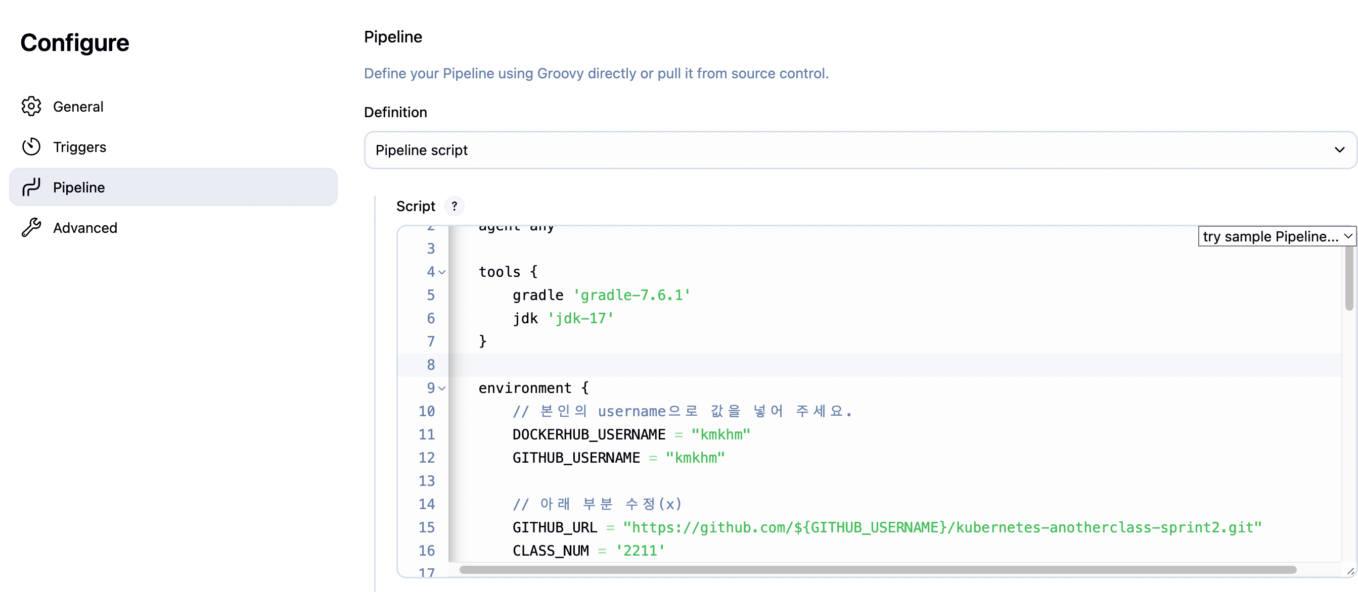 이후 해당 Pipeline Item 내부에서 Jenkins Pipeline Script를 작성합니다. 스크립트는 수동으로 직접 작성할 수도 있고, UI로 설정한 뒤 Snippet Generator를 통해 자동 생성할 수도 있습니다.
