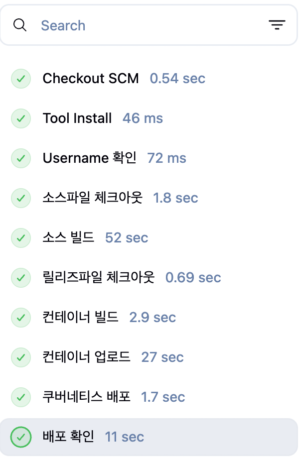 Jenkins Pipeline을 실행하면, 각 단계가 어떻게 진행되었는지 시각적으로 확인할 수 있는 Pipeline Overview 탭이 자동으로 생성됩니다. 위 이미지와 같이 Tool Install, Source Build, Container Build, K8S Deploy 등 파이프라인에서 정의한 각 단계가 순차적으로 수행되며, 각 단계별 소요 시간과 성공 여부를 직관적으로 확인할 수 있습니다. 빌드 실패 시 어느 단계에서 문제가 발생했는지 빠르게 파악하는 데에도 매우 유용합니다. 각 단계에서 실제 실행된 명령어 로그도 상세히 확인할 수 있어 디버깅 시에도 큰 도움이 됩니다.