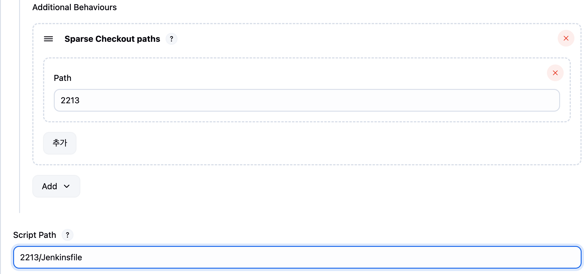 이전 단계에서 작성한 Jenkinsfile과는 경로가 다르기 때문에, Sparse Checkout Path와 Script Path 항목만 아래와 같이 수정해주었습니다.