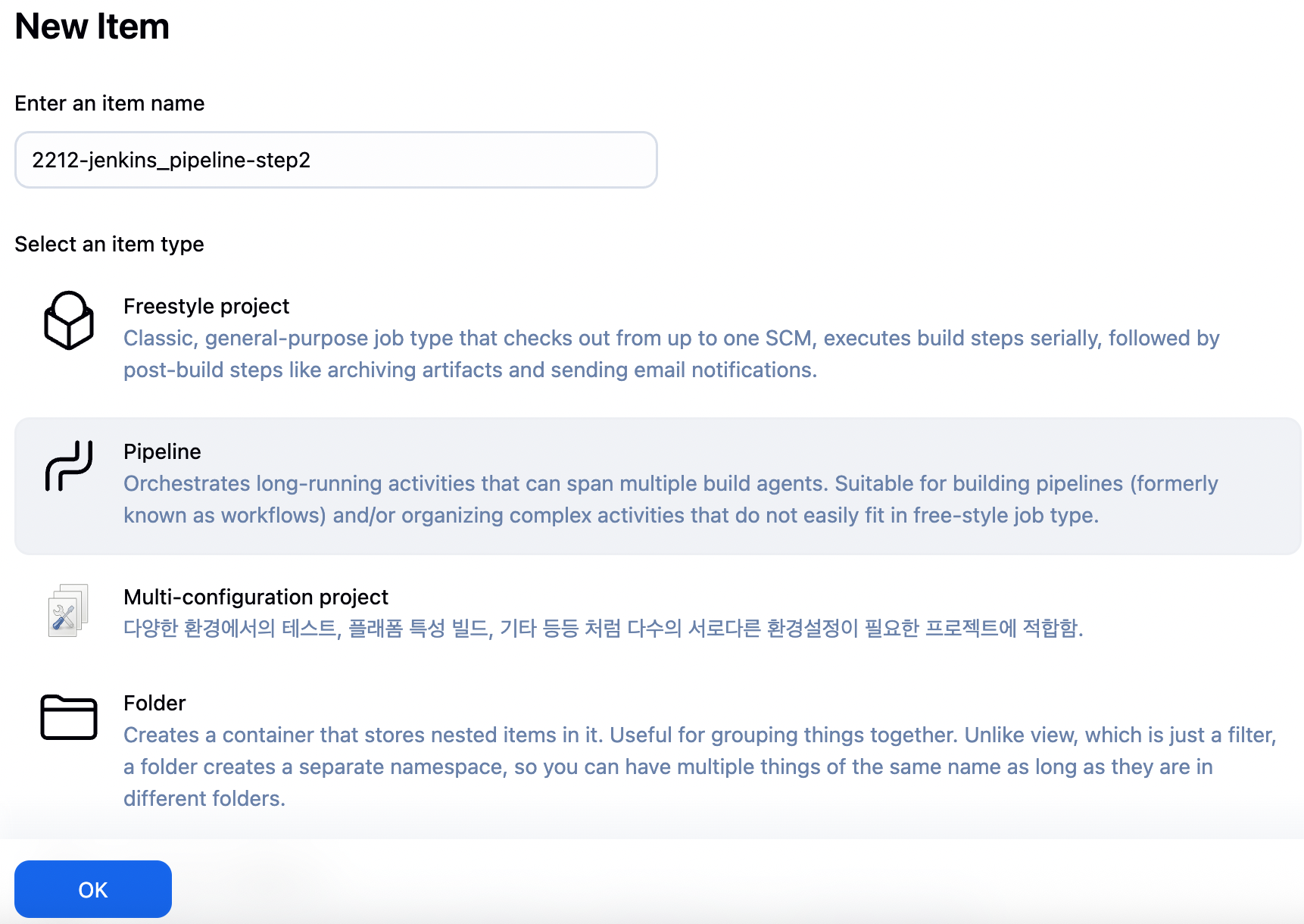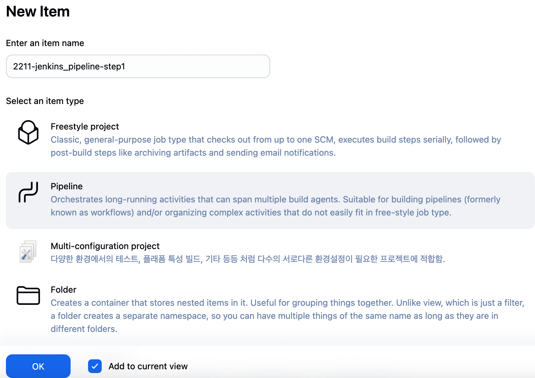 이번에는 세분화하여 GitHub와의 연동을 설정하고, Jenkins가 특정 디렉토리의 Jenkinsfile만을 읽어 들이도록 설정하는 방법을 정리해보겠습니다. 먼저 새로운 Item을 생성해줍니다.