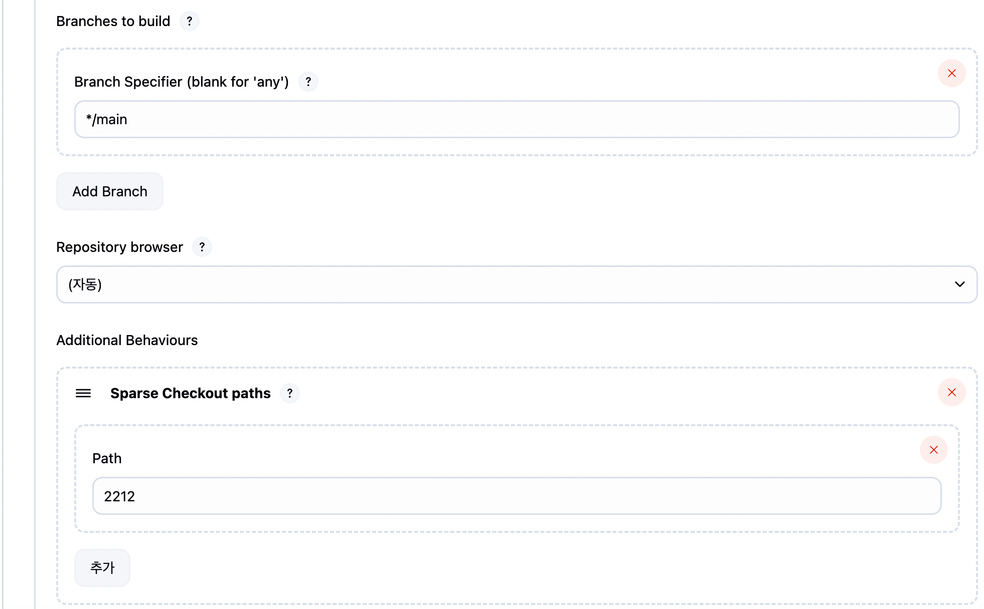 - Additional Behaviours > Sparse Checkout paths 추가 => Path: 2212 (해당 폴더만 체크아웃)